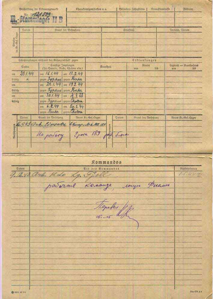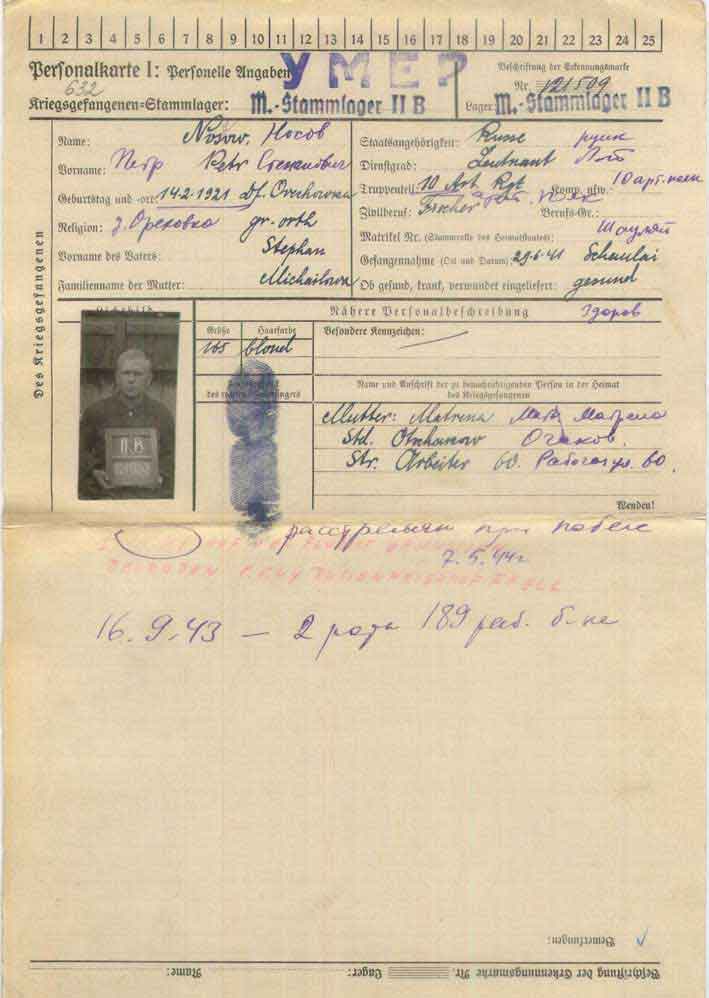 Personalkarte på fange Peter Nosov skutt på Fjell, Hordaland. Den kyrilliske skriften er påpåført etter krigen, i russiske arkiv. Kopi fra Rolf Keller, Tyskland.