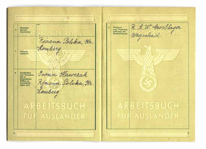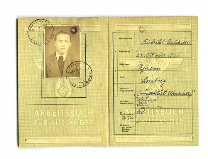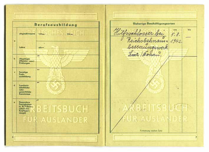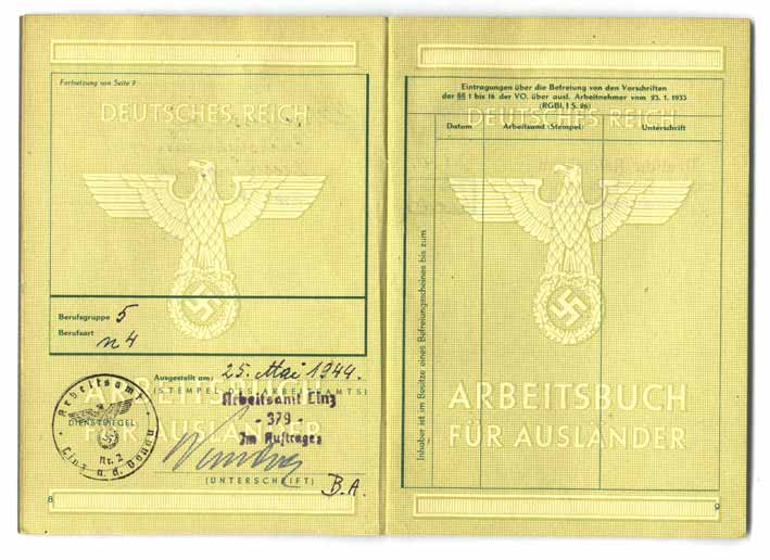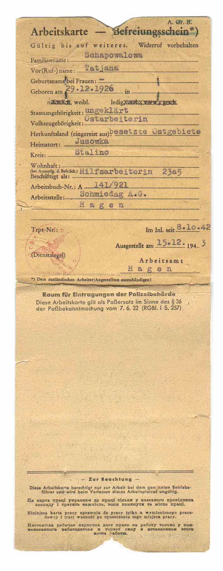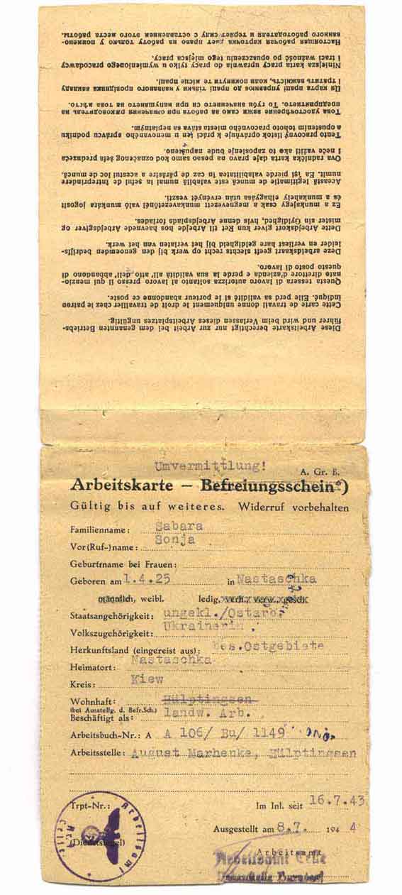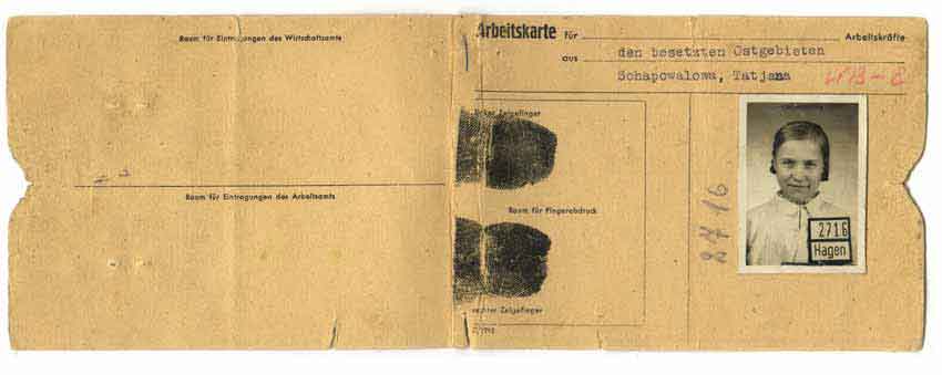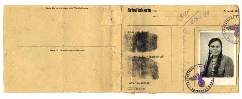 Arbeitskort for østarbeidere i Tyskland. Den yngste jenten var bare 15 år da hun ble sendt til Tyskland. Fra Michael Stokkes samling. |