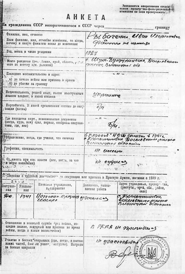 ”Anketa”, første side av et spørreskjema fra NKVD til bruk for de repatrierte krigsfanger og sivile. Den sivile tvangsarbeideren (østarbeideren) var på Trandum, Gimle og Hønefoss. Dokument fra arkiv i Kiev, Ukraina.