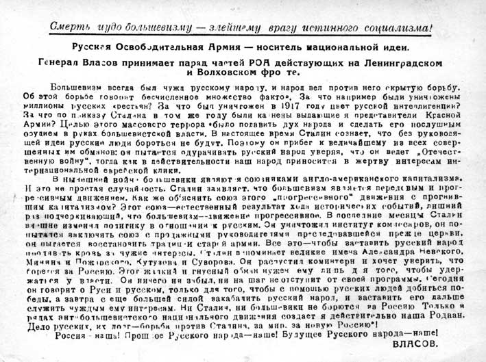 Propagandatekst for Russlands frigjøringsarme og general Vlasov, 1943. Fra Michael Stokkes samling.